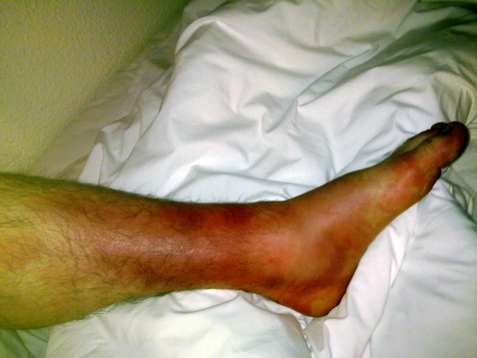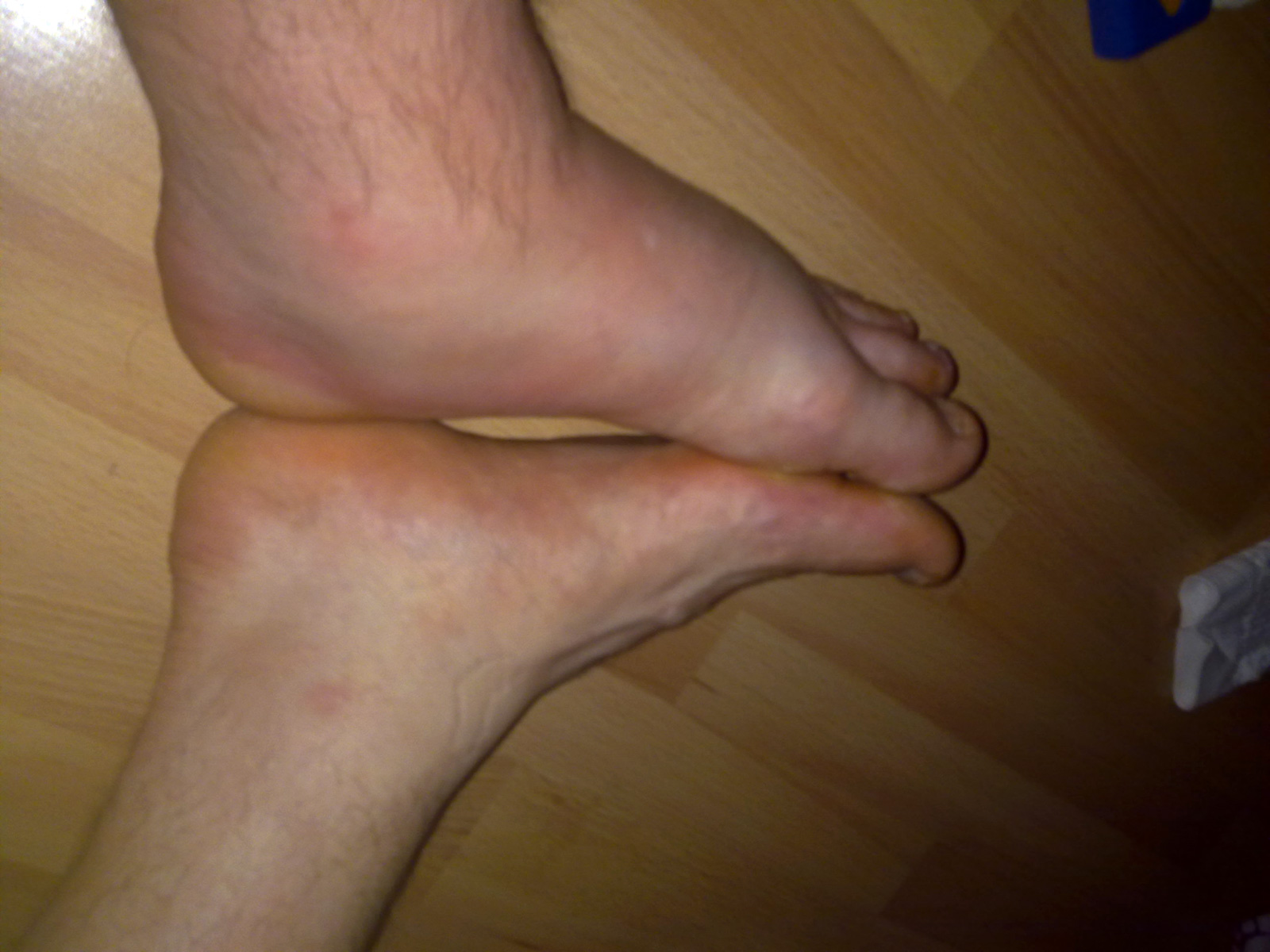 Palautuminen. Paluumatka oli tuskainen sillä kävely ei onnistunut lainkaan. Kykenin ottamaan hyvin pieniä askelia siten että vasen jalka oli aina oikean edellä tai tasalla. Jasemman jalan jalkaterä ei taipunut lainkaan. Ensimmäisenä iltana kisan jälkeen jalka oli aivan tulipunainen (kuva alla). Kisan jälkeisenä aamuna matkat juna-asemilla ja lentoasemilla oli tehtävä joukkuetoverien suosiollisella avustuksella niin matkalaukkukärryissä kuin Helsingin lentoasemalla rullatuolissakin. Jalan punaisuus laski päivässä, mutta turvotus lisääntyi ja oli pahimmillaan noin 2-3 päivää juoksun jälkeen. 4-5 päivän päästä turvotus alkoi laskea ja jalkaterän liikkuvuuskin parani hieman, mutta edelleenkin kävelyvauhti oli vasta 50 % normaalista. 6 päivän päästä turvotusta oli vielä jonkin verran, mutta jalkaterä edelleen jäykkä ja nilkka kipeä pohkeen etuosasta sekä akilleksen tienoilta. Lisäksi oikean jalan polvi oli kipeä vasemmalta puolelta ja pohkeen alaosassa, niin-ikään vasemmalla sivulla, oli myös kipupiste. Kompressiosukkaa käytin vasemmassa jalassa 5:nä ja 6:na päivänä, jolloin turvotus selvästi laski. Sitä ennen turvotus oli luonnollisesti laskenut ainakin puoleen, jotta sain kompressiosukan hyvin jalkaan.