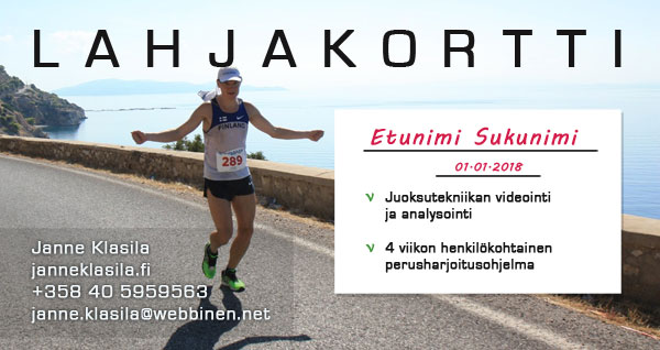 Tarjoan harjoitusohjelmien luontia kestävyysjuoksuharjoitteluun, nuorille ja vanhoille, keskimatkoista polku- ja ultrajuoksuun. Tarvittaessa voin mm. videokuvata ja analysoida juoksutekniikan. Perusveloitukseni on 40 euroa tunti. Esimerkiksi: